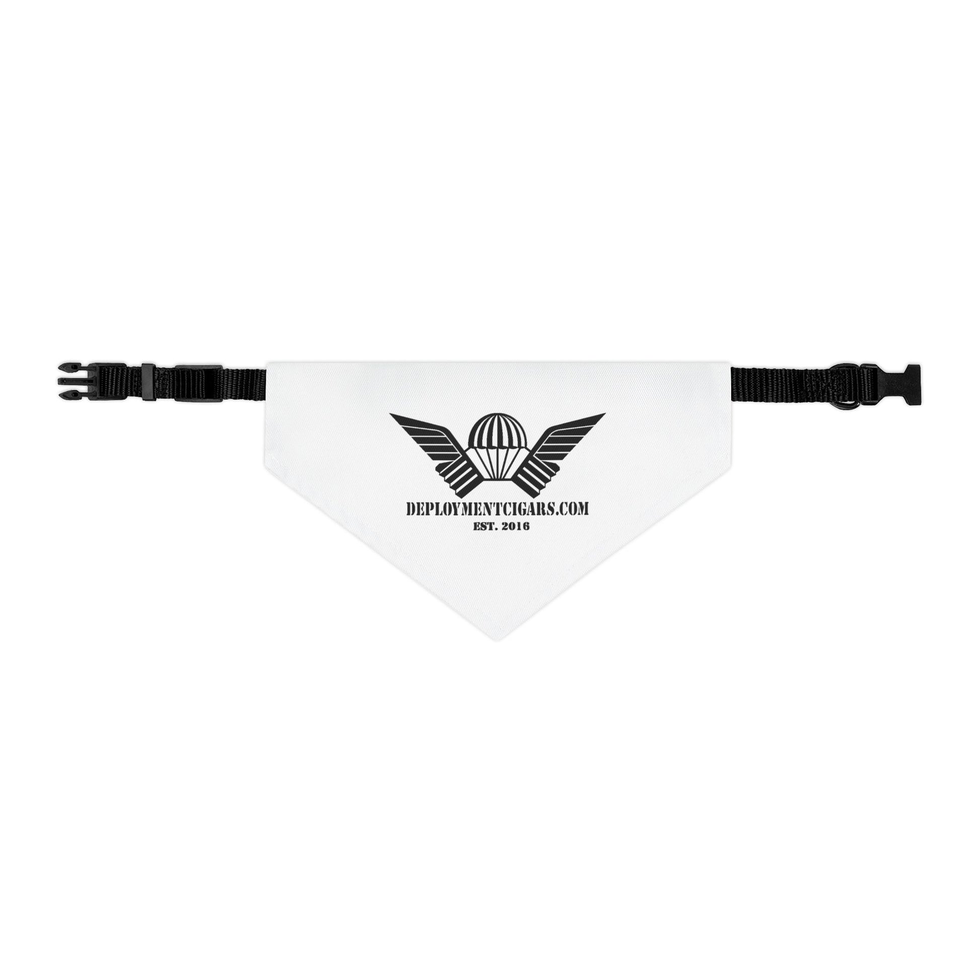 A crisp, lightweight pet bandana collar that brings quiet confidence to your dog’s everyday look. Made from durable polyester with a clean white field and bold monochrome insignia, it sits neatly beneath the chin and pairs with the adjustable black collar for a secure fit. The triangular silhouette frames the face, adding an understated, military-inspired edge that suits walks, meetups, and casual photos. Hemmed edges and a sturdy buckle mean it holds up to play and quick wash-and-dry routines, while four sizes help you find the right drape for small to large pups.